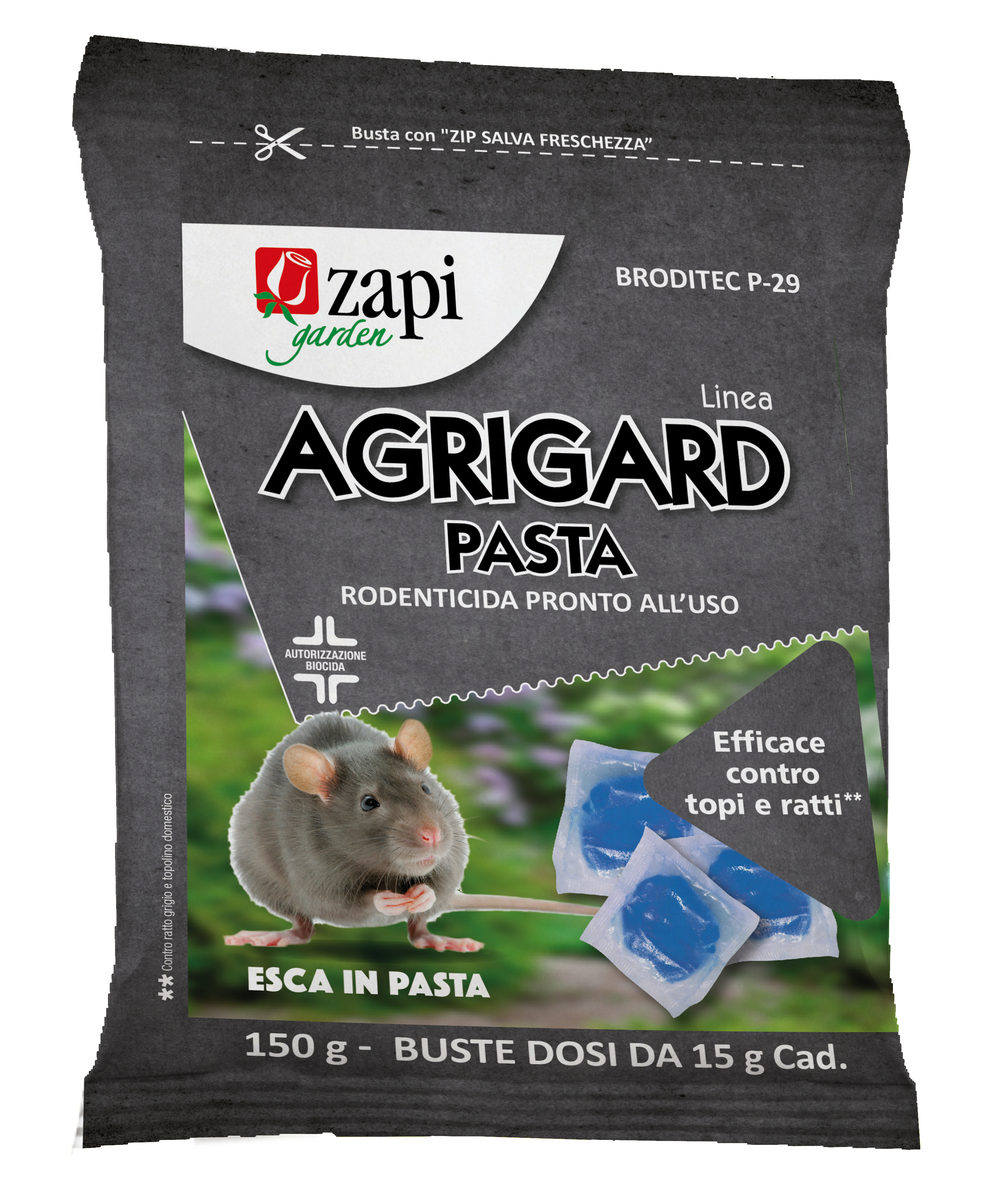 Per il controllo del Ratto grigio - Uso all’interno ed intorno agli edifici: Utilizzare fino a 90 g di esca per contenitore e posizionare quest’ultimi ad una distanza di 10 m l’uno dall’altro. Ridurre tale distanza a 5 metri in caso di forte infestazione. Per garantire la massima sicurezza e la massima efficacia, utilizzare contenitori specifici per esche topicide Zapi tipo “Bait Station” o “T-Dispenser”.