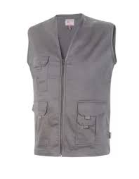 Gilet da lavoro in cotone dotato di tre ampie tasche multifunzionali chiuse con pattina e velcro; gancio porta badge in corrispondenza della tasca sul lato destro del petto.