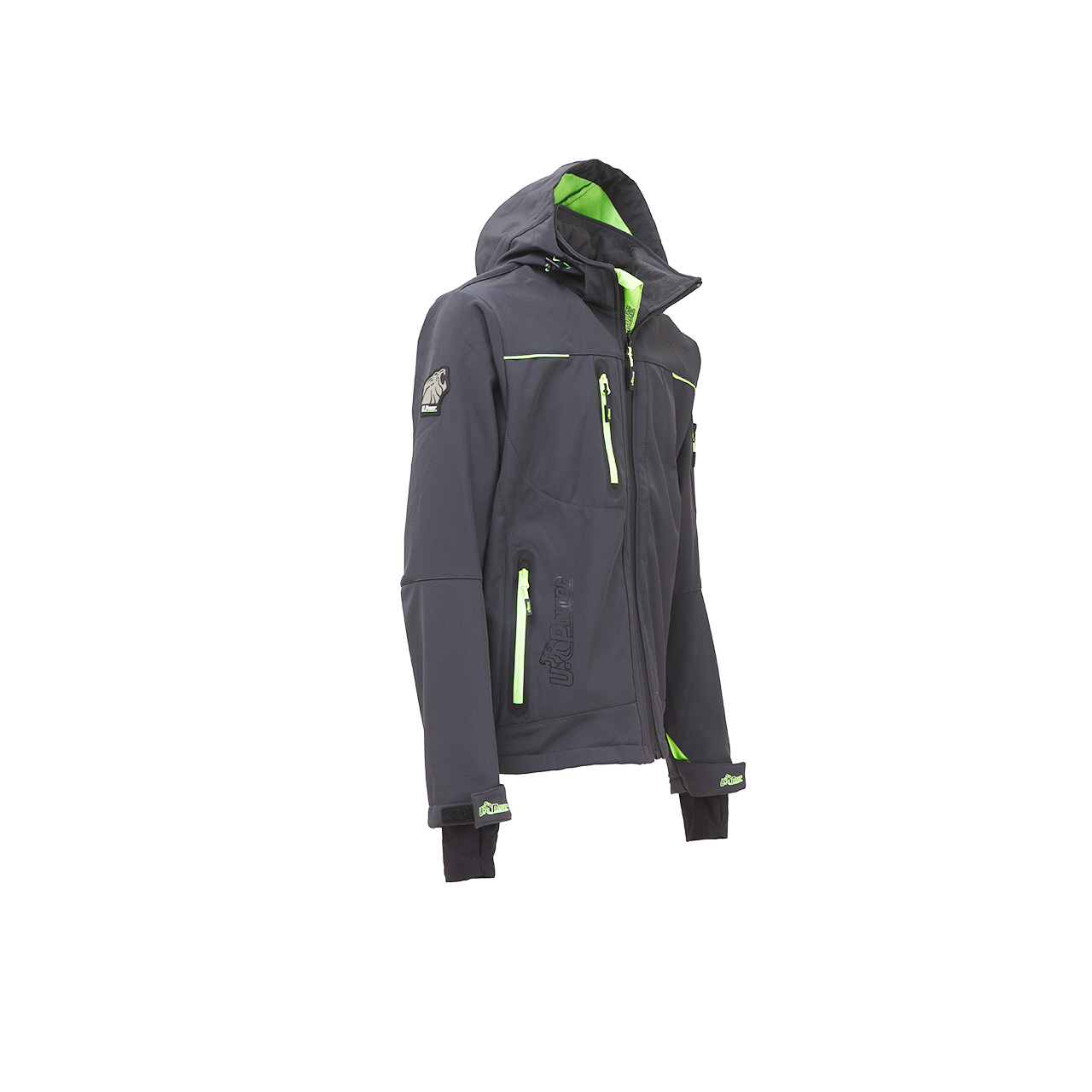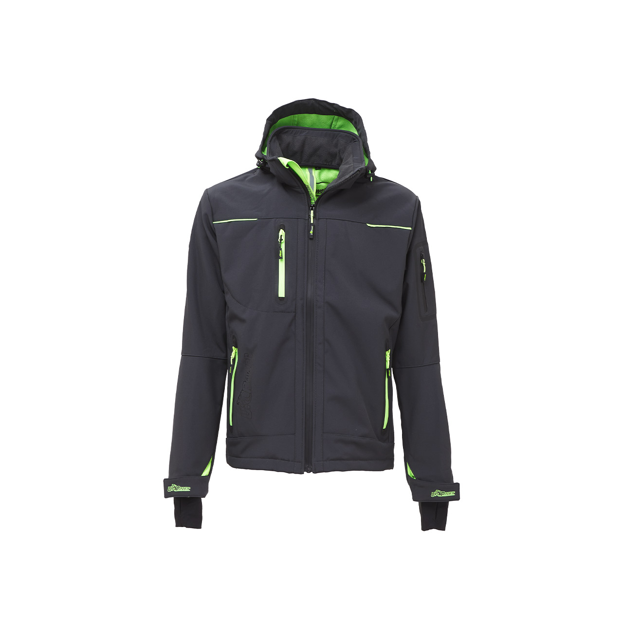 Giacca in Softshell con membrana U-Tex che rende il tessuto idrorepellente, traspirante e antivento. Giacca molto comoda e resistente con una fodera interna in morbido micro-fleece fluo. Chiusura centrale con zip impermeabile. Maniche preformate per vestibilità ottimale, cappuccio regolabile e staccabile, polsini regolabili con velcro e polsino antivento elasticizzato con foro passa-pollice. Dotato di due tasche frontali chiuse con zip fluo e coulisse antimpigliamento regolabile all’interno. Una tasca porta cellulare sul petto con tecnologia Free Sound chiusa con zip fluo. Due ampie tasche interne. Tasca supplementare termosaldata su manica sinistra. Fondo sagomato. Nastro reflex su colletto nella parte posteriore. Logo U-Power tono su tono.