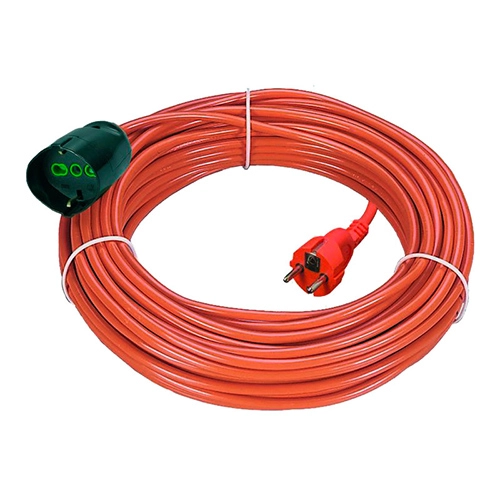 lunghezza cavo m.25 colore arancio - cavo H05VV-F sezione 2x1,5 - spina e presa schuko 2P 16A - 250V - watt 2200 - portata massima watt 3500 - protezione IP44 in confezione termoretraibile.